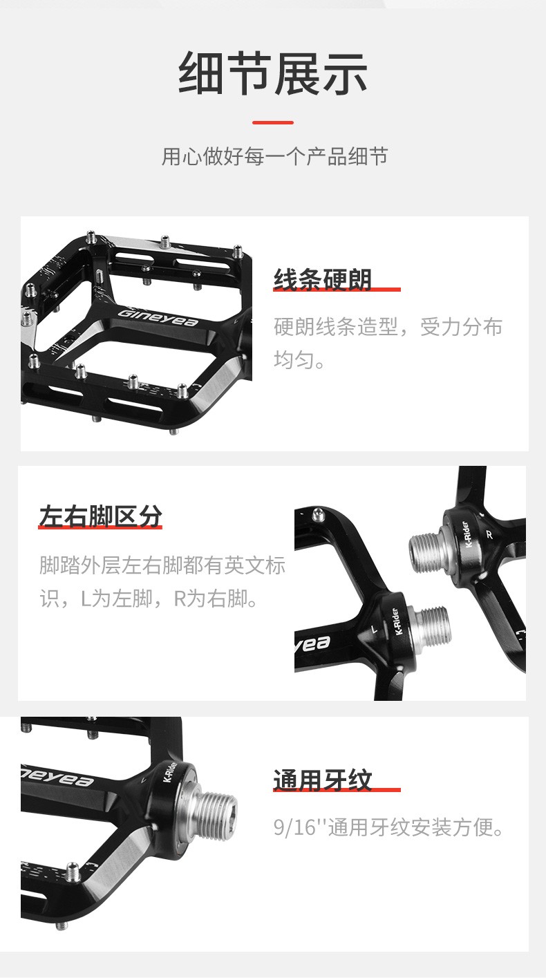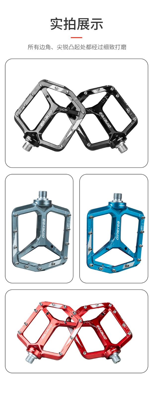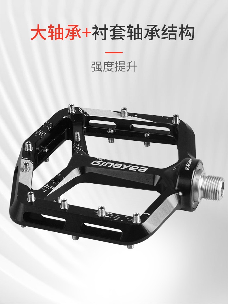 景曄新款C6系列外觀設計比較個性化,造型設計相同,采用嵌套軸心的一個設計,所有邊角尖銳凸起除都經過細致打磨,鋁合金CNC本體,珞鉬鋼軸心,騎行更省力,采用大軸承+襯套的一個設計,尺寸分大中小,大號用于速降,中號用于CX,林道,泵道,小號用于童車