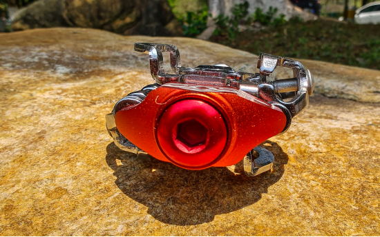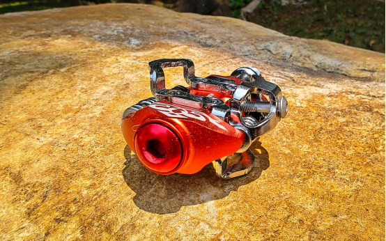軸心通過一枚陽極紅的大螺絲固定,通過內(nèi)六角拆裝,簡化了保養(yǎng)流程。軸心使用正反牙設(shè)計,防止螺絲隨著踩踏松脫。